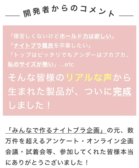 ※「サイズが変わる」「胸が大きくなる」などの表現は用いません。ナイトブラは衣料品であり、着用により身体の形状変化を保証するものではありません。
