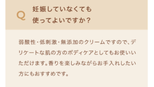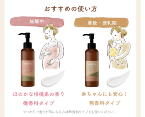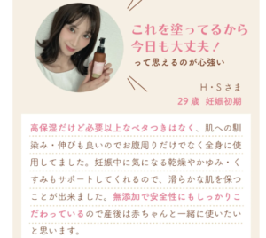 [/char] [char no=”5″ char=”なつみ”]妊娠線の予防に購入ガサガサだったお腹もしっとり無香料なので私でも使えました[/char]