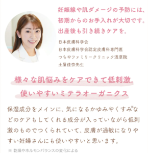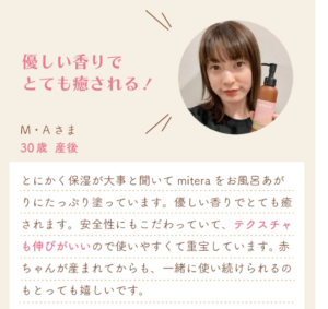 完全無添加なので肌にも優しいので安心して使えますよ[/char] [char no=”4″ char=”えりこ”]産前から産後まで安心して使えるmiteraの妊娠線予防クリーム