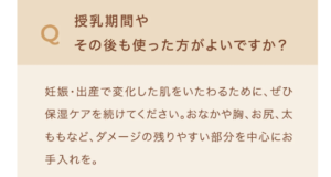 妊娠中は体の変化がすごいので大きくなったお腹の妊娠線とバストトップとワキの黒ずみ対策にアプローチしてくれます[/char]