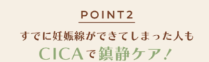 | 特徴 | ★CICA配合で揺らぎがちな産前産後のママの肌サポート ★6つのフリー処方で肌に優しい ★GMP認定工場の国内で生産なので安心 |