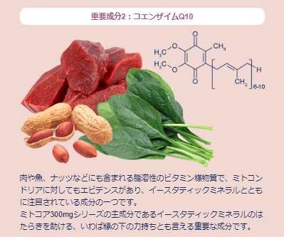 肉や魚、ナッツなどにも含まれる脂溶性のビタミン様物質で、ミトコンドリアに対してもエビデンスがあり、イースタティックミネラルとともに注目されている成分の一つです。