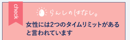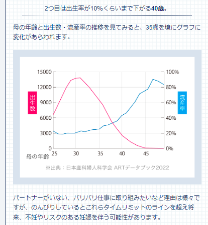 パートナーがいない、バリバリ仕事に取り組みたいなど理由は様々ですが、のんびりしているとこれらタイムリミットのラインを超え将来、不妊やリスクのある妊娠を伴う可能性があります