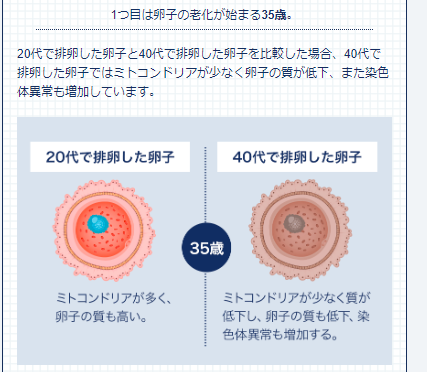 20代で排卵した卵子と40代で排卵した卵子を比較した場合、40代で排卵した卵子ではミトコンドリアが少なく卵子の質が低下、また染色体異常も増加しています。