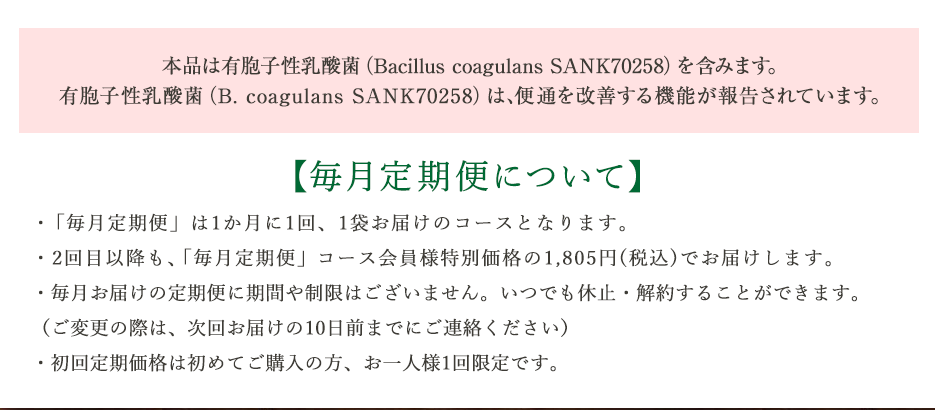 | 特典 | いつでも休止、解約ok 送料無料 |