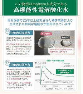 mofuwaスキンケアミストは国内工場にて ヒューマングレードで製造 mofuwaスキンケアミストは 清涼飲料水の規格基準をクリア 舐めてもok mofuwaスキンケアミストは 地肌の内側から直接潤いを 与えるので乾燥知らず 肌角質浸透力はなんと通常の水の35倍!地肌に直接潤いを与えます