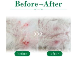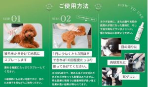 被毛をかき分けて地肌にスプレー 塗れる程度にたっぷりスプレー 敏感肌にもお使いが可能ですが 念のため様子を見ながらご使用ください 1日少なくとも3回ほど できれば10回程度たっぷり使ってください