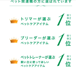 トリマーが選ぶペットケアアイテム1位👑 ※1※2 ブリーダーが選ぶペットケアアイテム1位👑 ※1※3 ペットトレーナーが選ぶ飼い主に使ってほしい ペットケアアイテム1位👑 ※1※4 ※1 調査方法 インターネット調査 調査期間 2020年8月5日-7日 アンケートモニター調査元 ゼネラルリサーチ ※2 調査対象 全国の20代から50代の男女(トリマーの方)1,001名 ※3 調査対象 全国の20代から50代の男女(ブリーダの方)1,003名 ※4 調査対象 全国の20代から50代の男女(ペットトレーナーの方)1,003名