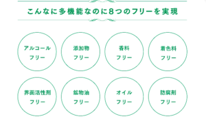 アルコールフリー、添加物フリー 香料フリー、着色料フリー 界面活性材フリー、鉱物油フリー、 オイルフリー、防腐剤フリーを実現