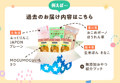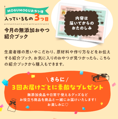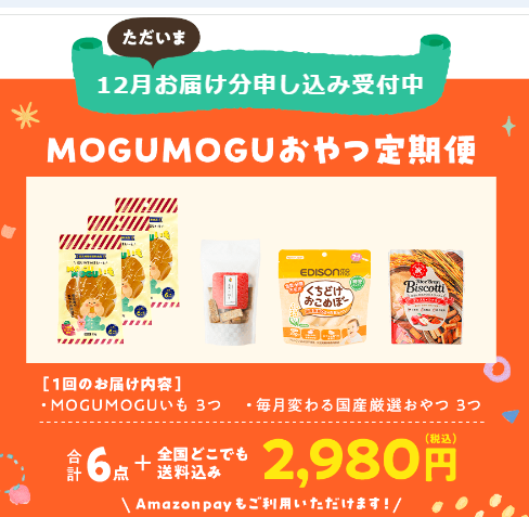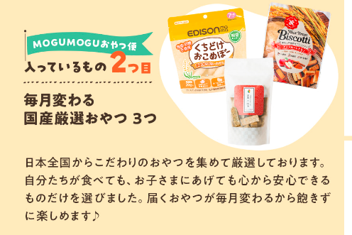 | 同封物 | もぐもぐいも3つ+毎月変わる国産厳選おやつ3つ |