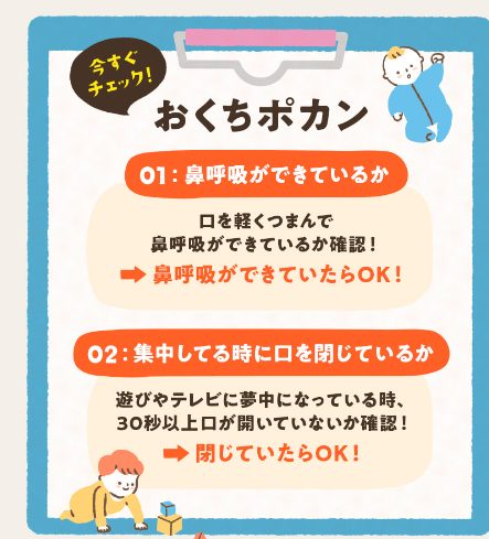 鼻呼吸ができていたらok集中しているときに口を閉じているか遊びやテレビに夢中になっているとき、