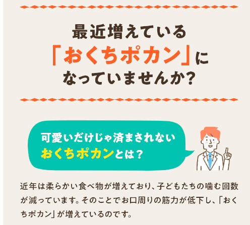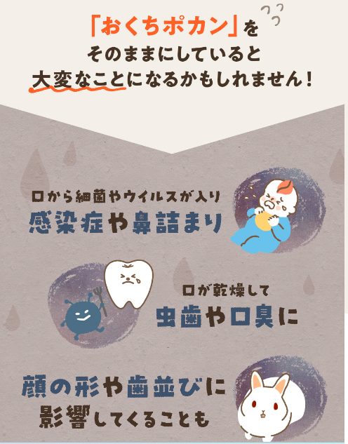 | おすすめの人 | 子どもがお口をぽかんと開けている 口から細菌が入り、鼻づまりかも 歯並びが悪くなるのは.. 子どもの栄養不足は不安 |