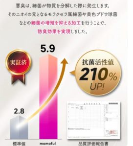 悪臭は細菌が物質を分解したときに発生 その匂いの基となるモラクセラ属細菌や 黄色ブドウ球菌など細菌の増殖を抑える加工を行うことで防臭効果を実現 品質評価報告書では抗菌活性化が210%もUP!