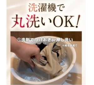 お手入れルーティン 帰宅後すぐぬるま湯で軽く予洗い→洗濯ネット→陰干し。私は柔軟剤を少なめにして、生地の風合いをキープしています(表示に従う)。引用公式