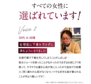 仕事中何度もお手洗いに行くことが出来ないから 吸水ショーツがとても役に立ってます ニオイも蒸れもほとんど気にならなくて 仕事に集中でき、欠かせないショーツになりました 引用公式