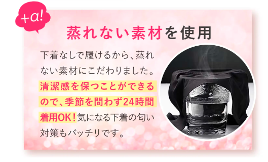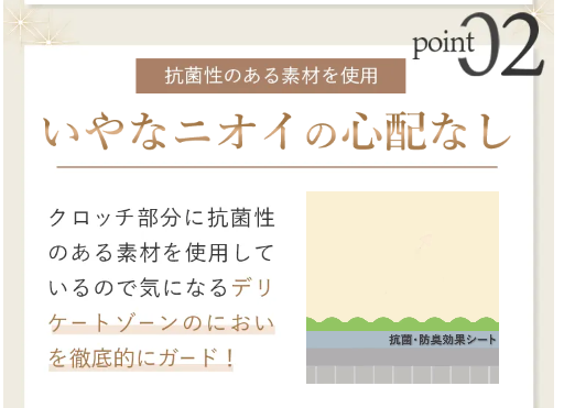 | 抗菌性のある素材を使用していやなニオイの心配なし | クロッチ部分に抗菌性のある素材を使用 デリケートゾーンの臭いを徹底ガード |