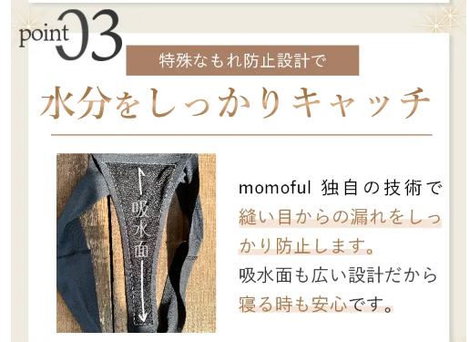 | 水分をしっかりキャッチ | モモフル独自の技術で、縫い目から漏れをしっかり防止 給水面も広い設計だから寝るときも安心 |