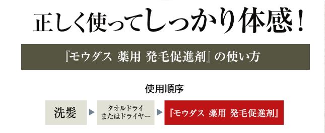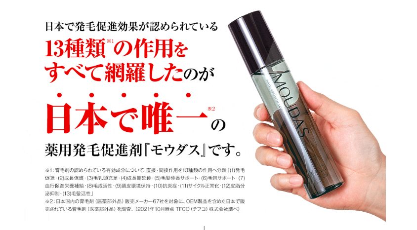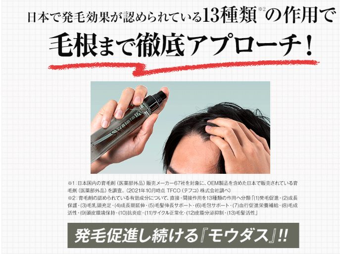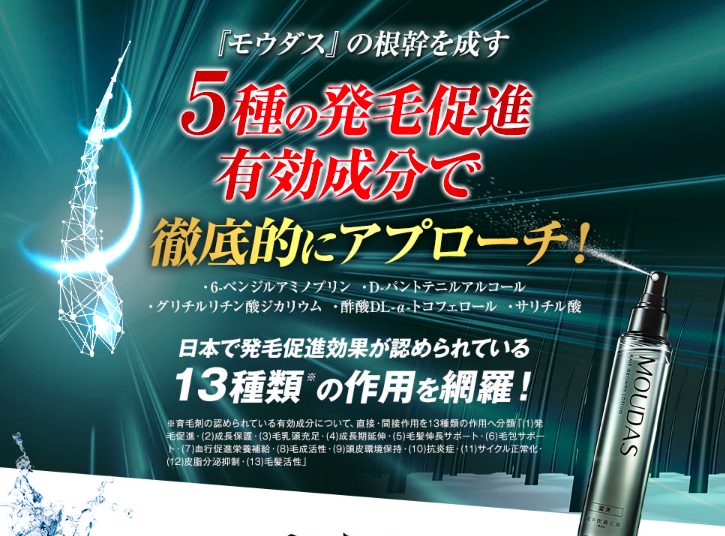 - 13 モウダスの根幹を成す5種の発毛促進有効成分で徹底的にアプローチ