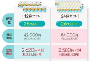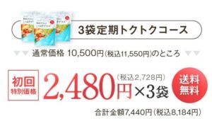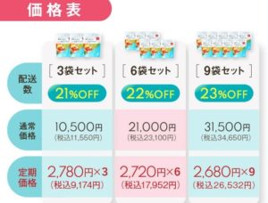 | 3袋定期コースの値段 | 初月2,728円x3袋 合計8,184円(税込)最大26%OFF |
