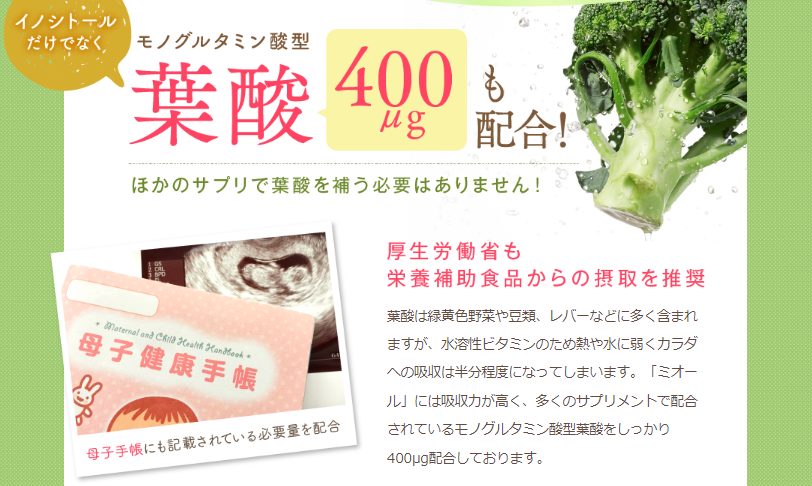 「ミオール」には吸収力が高く、多くのサプリメントで配合されているモノグルタミン酸型葉酸をしっかり400μg配合しております。