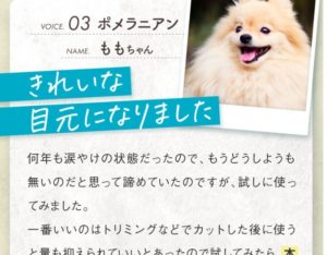 [char no=”4″ char=”えりこ”]去年からわんこが涙やけで困っててて動物病院に連れていても変わらず知りあいから涙やけクリアを教えてもらって愛犬の肌に害になるものがないので安心して使える目の周りの皮膚が柔らかくなっているのは