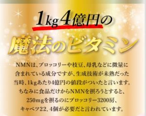 NMNはブロッコリーや枝豆、母乳などに微量に含まれている成分ですが、生成技術が未熟だった当時、1㎏当たり4億円の値段が付いたと言われてますちなみに食品だけからNMNを取ろうとすると