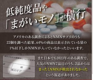 22個を調べた結果、64%の商品は表示されている量の1パーセントしかNMNが入ってなかったと言われてますまた日本でも2023年のある調査で人気のNMN7品目のうち2品からまったくNMNが検出されなかった