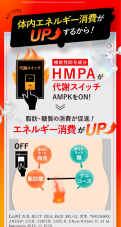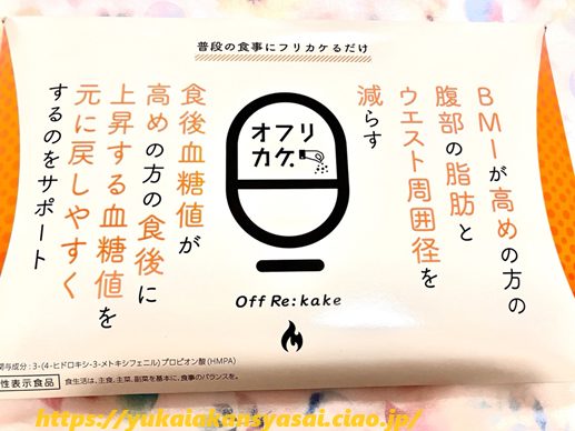 | オフリカケのメリット | ★機能性関与成分 3-4-ヒドロキシ-3メトキシフェニル ★無味無臭だから味を変えずに楽しめる ★(HMPA)は有名大学と製薬会社が研究した原料 ★(HMPA)は有名医学誌に掲載 |