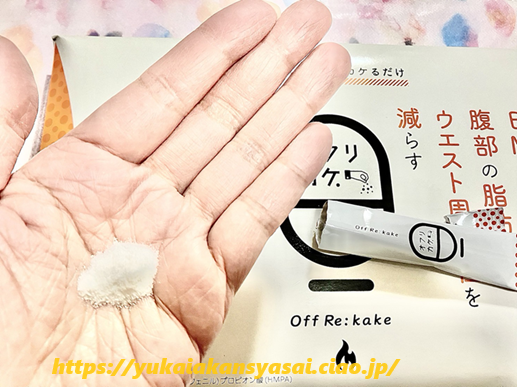 | オフリカケはいつ飲めばいい? | 1日1袋を目安に、お客様が続けやすいタイミングでお好きな食べ物やお飲み物に混ぜてお召し上がりください |