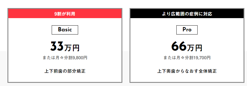 | 価格 | 一律33万円 ※マウスピースを破損、紛失の場合は別途料金が発生します。 ※上下前歯の部分矯正 | 平均77万円から110万円 |