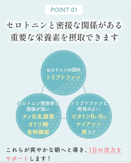 睡眠リズムのサポート睡眠ホルモン「メラトニン」の材料にもなり、体内リズムと関係があるとされています。