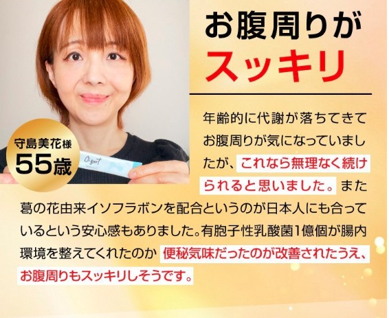 乳酸菌が生きて腸まで届くため、お通じのすっきり感を実感でき、腸内環境の改善が期待できそうです気になるぽっこりお腹も、スッキリしてきて、スタイルやおしゃれにも前向きになってきました