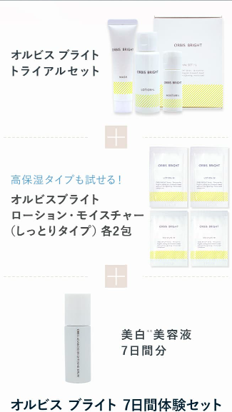| セット内容 | オルビスブライトローション・モイスチャー 美白*美容液7日分 *メラニンの蓄積を抑え、シミ、そばかすを防ぐ |