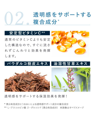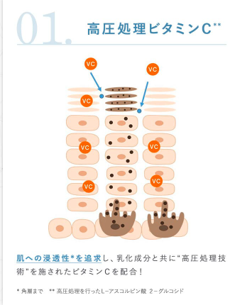 | メリット | 高圧処理ビタミンC配合* 透明感をサポートする複合成分*** Wのアプローチでキメの整った肌へ |