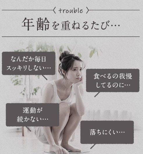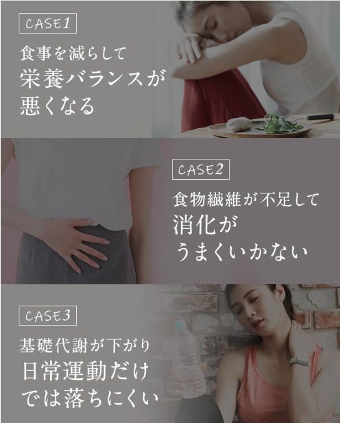 | おすすめの人 | なんか毎日スッキリしない人 食べるのを我慢しているのに痩せられない人 運動が続かない人 年齢を重ねてから落ちにくい人におすすめ |