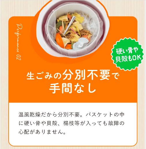 ボタンひとつで生ごみをカラカラに乾燥してくれるから、悪臭・液だれ・虫の発生をグッと抑えられるのが魅力。