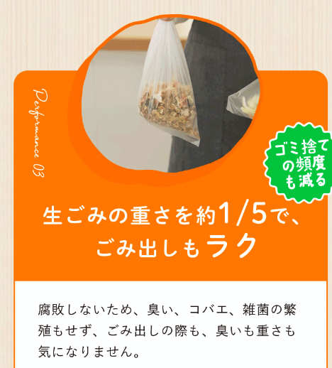 • 生ごみの水分と雑菌を乾燥させ、嫌なニオイ・虫・液だれ・悪臭を防ぐ