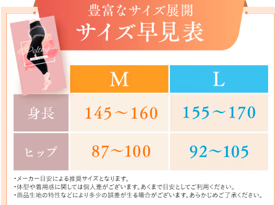 - 目安はヒップ・太もも周り。境界サイズで迷う場合は、着圧に慣れていない人は上のサイズを検討。