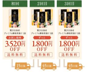 | 2回目 | プレミアム酵素茶漬け3袋 ずっと1,800円OFF! | 45日後 |