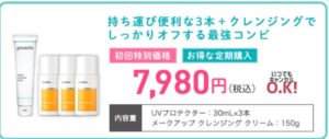 | 同封物 | 6か月お届けコース プロアクティブ UVプロテクター 30mlx3本メークアップクレンジングクリーム 150gがセットで |