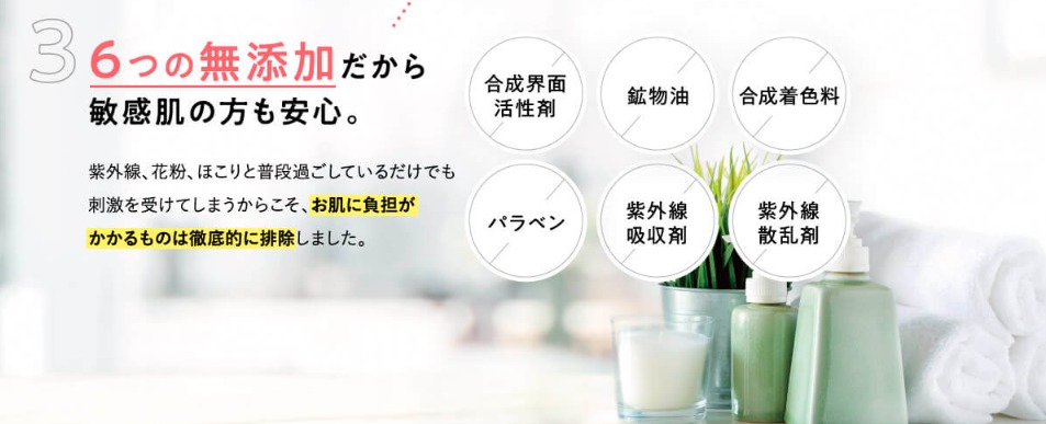 紫外線、ほこり、花粉と普段過ごしているだけで、刺激を受けてしまうからこそ、お肌に負担がかかるものを徹底的に排除しました。