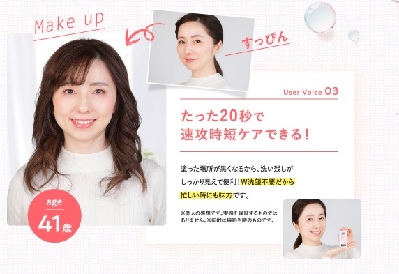 | 使い方は? | 5mmほど出して、水などで濡らす ↓ メイクの上からフィットするように塗る ↓ 円を描くようになじませる ↓ 水でしっかりすすぎ |