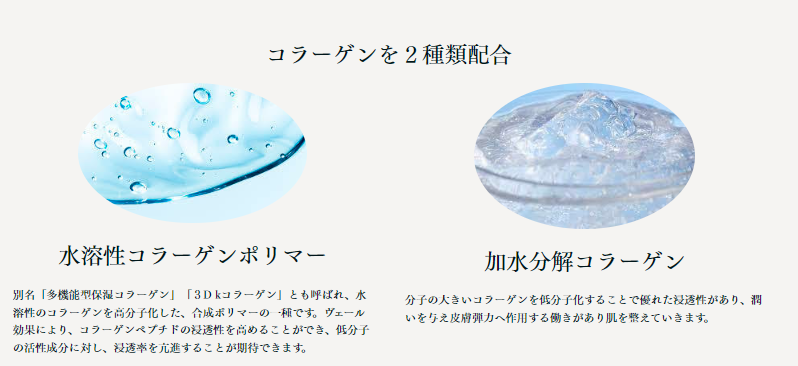 | Wコラーゲン 加水分解コラーゲン 水溶性コーラゲン | Wコラーゲン 加水分解コラーゲンと水溶性コラーゲンクロスポリマーの2種のコラーゲンを配合。ヴェール効果により、コラーゲンペプチドの浸透性を高め、優れた浸透率が期待できます。 コラーゲンペプチドの浸透力を高めます |