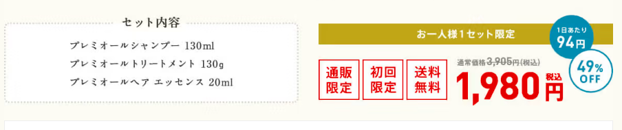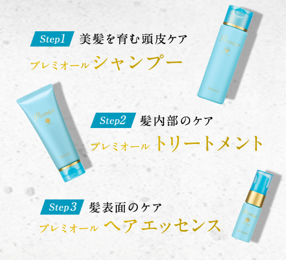 | セット内容 | プレミオールシャンプー130ml プレミオールトリートメント130ml プレミオールヘアエッセンス20ml |