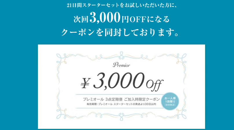 | 1 | 21日間のスターターセットをお試しになった方限定、次回3,000円OFFのクーポンを同封 |