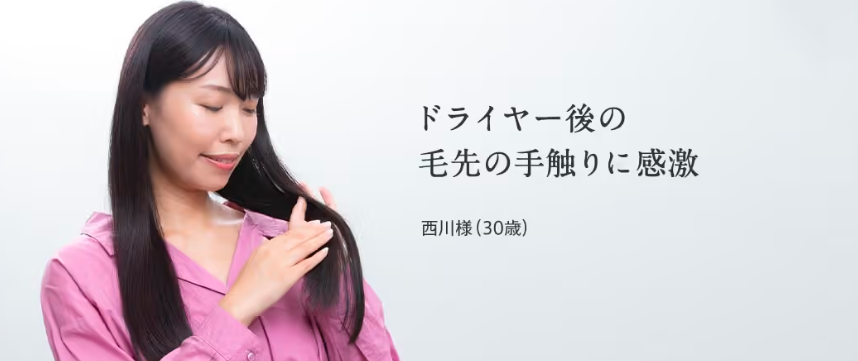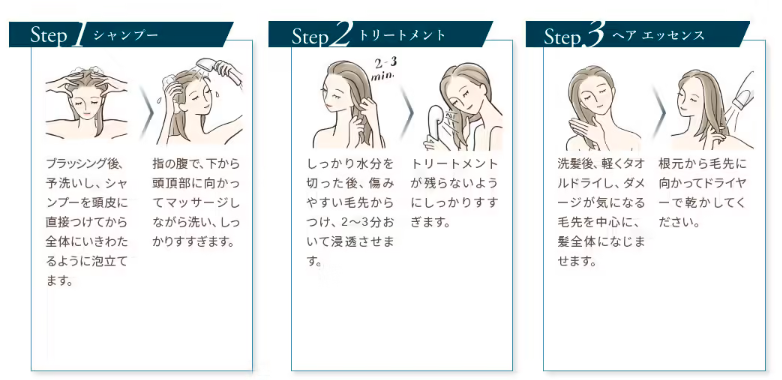 | ヘアエッセンス | 洗髪後、軽くタオルでドライし、 根本から毛先に向かってドライヤーで乾かしてください |