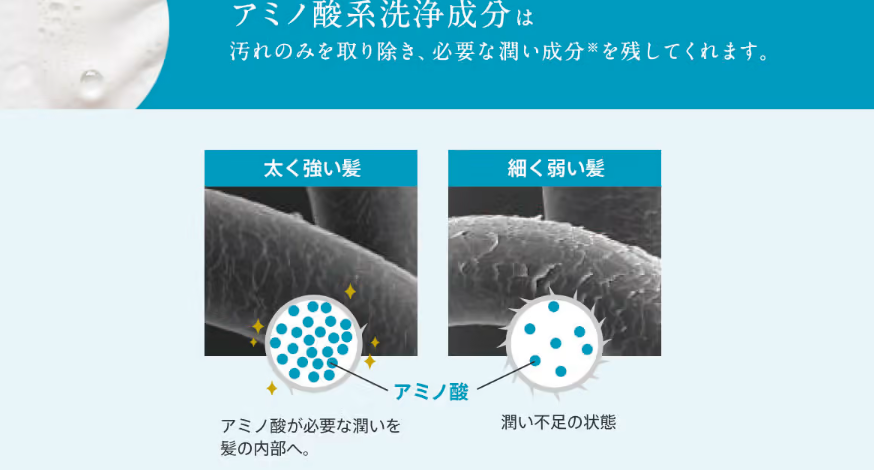 髪と同じ成分であるアミノ酸洗浄成分で洗うと汚れのみ取り除いて、必要な潤い保持成分を残してくれます
