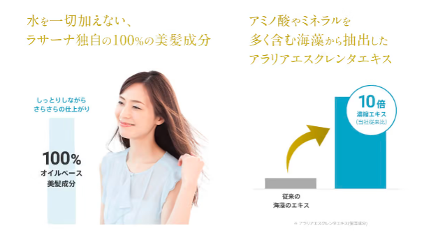 | 水を一切加えない ラサーナ独自の100%の美髪成分 | アミノ酸やミネラルを多く含む海藻から抽出したアラリアエスクレンタエキス |