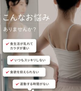 | おすすめの人 | 食生活が乱れて体が重い いつもすっきりしない 食欲を抑えられない 運動する時間がない 健康的に痩せたいけど、うまくいかない |