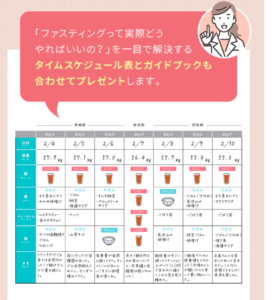 | 4 | 希望のファスティング開始日を決定 専属の担当者よりメッセージが届いた後 期間中の過ごし方はガイドブックで簡単にご覧 またガイドブックはスマートフォンによって |